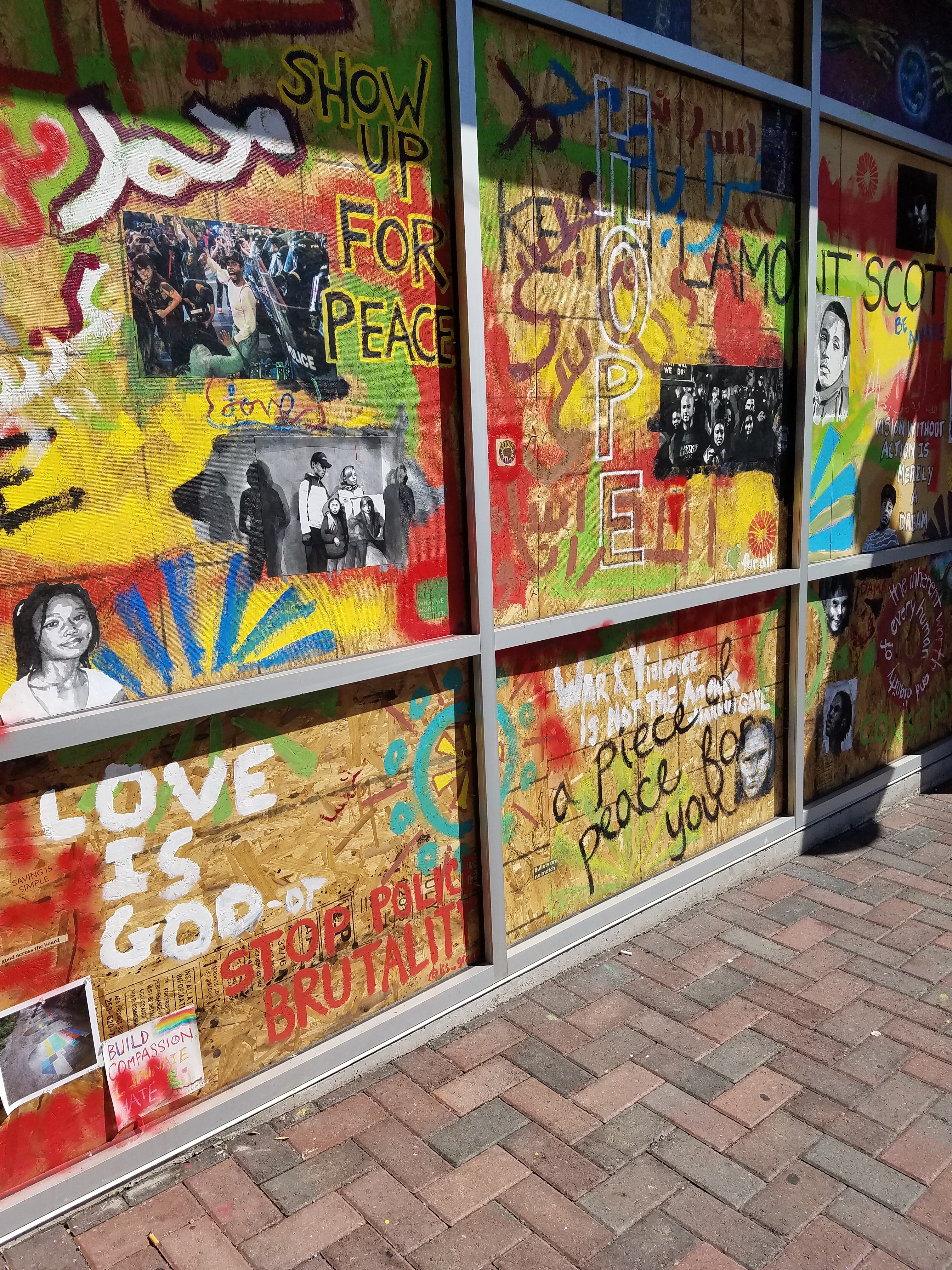 As I stood in front of the boarded facade, I was mesmerized by the murals someone, or more likely, a group of people, had painted. There were mini black-and-white portraits, and a life-sized weeping angel. Messages such as “Show up for peace” and “Vision without action is merely a dream” were painted across bright backgrounds.
