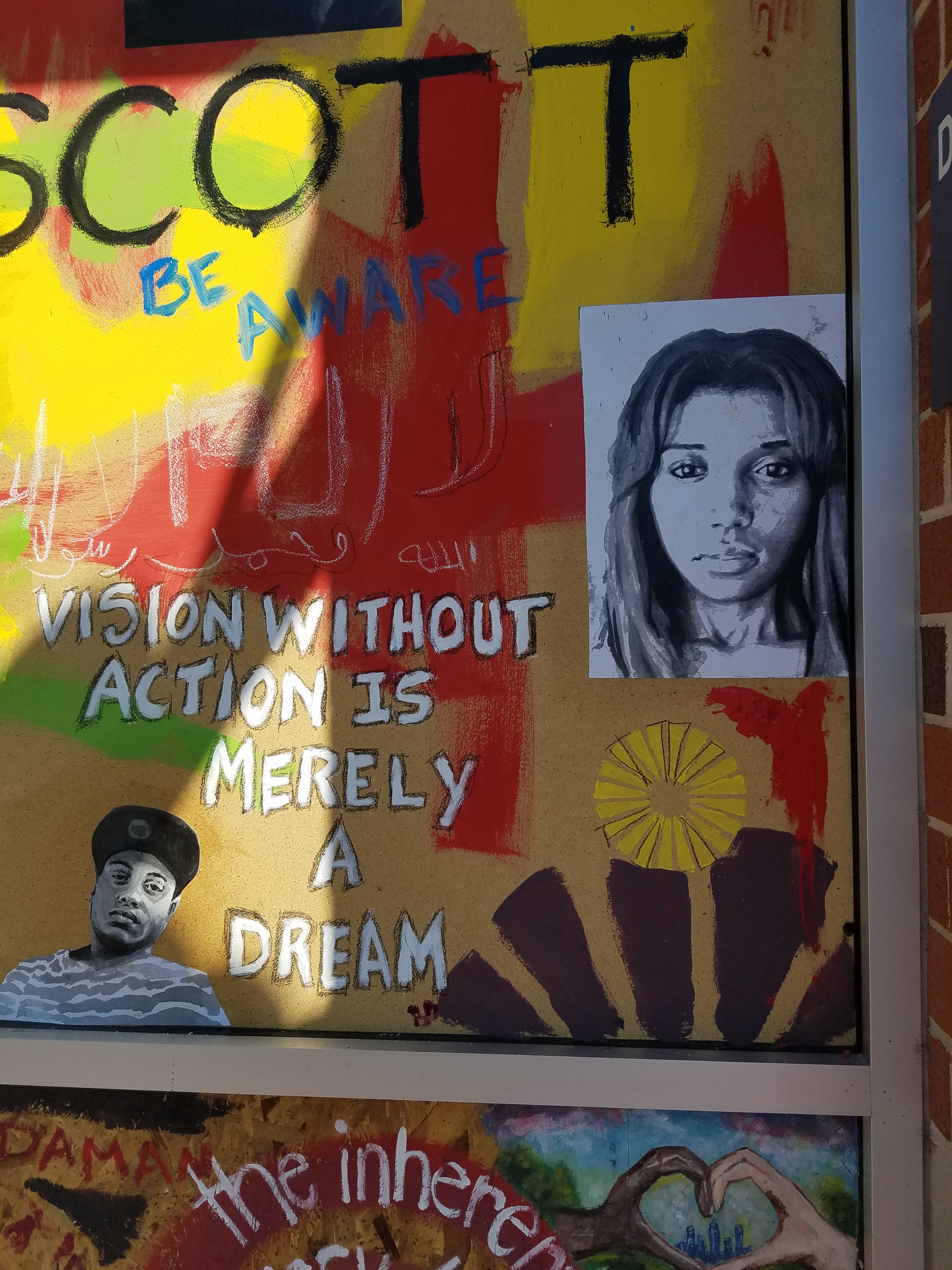 I wish this piece offered some sort of resolution about the police shooting here in Charlotte. It doesn’t. It’s merely an observation about the many worlds we live in in this country. I’m sharing photos I took of the murals because I found them powerful and compelling: